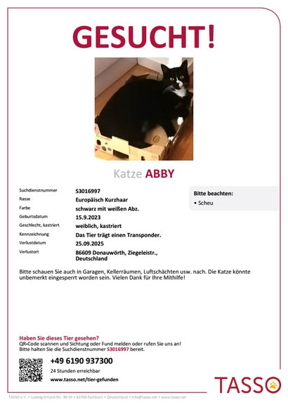 Katze Abby wird seit dem 25.09.2025 in 86609 Donauwörth vermisst.