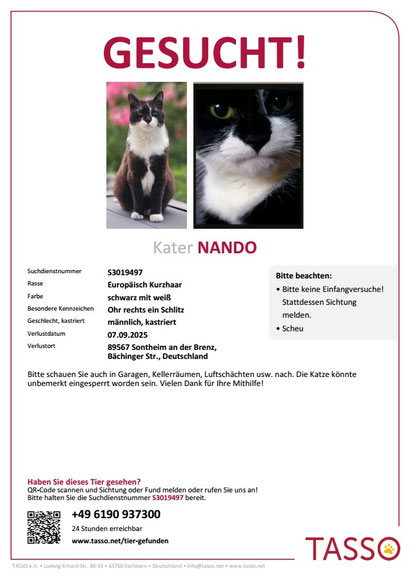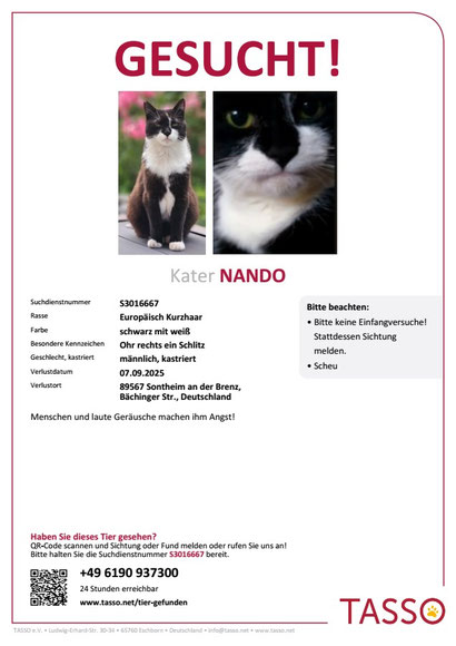 Weitere Angaben zu Nando finden Sie in seinem Suchplakat.