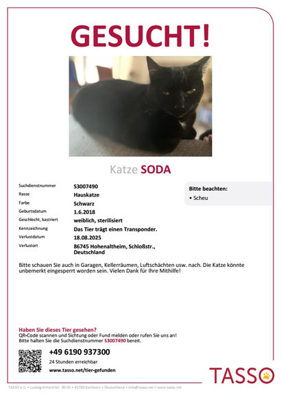 Katze Soda wird seit dem 18.08.2025 in 86745 Hohenaltheim vermisst.
