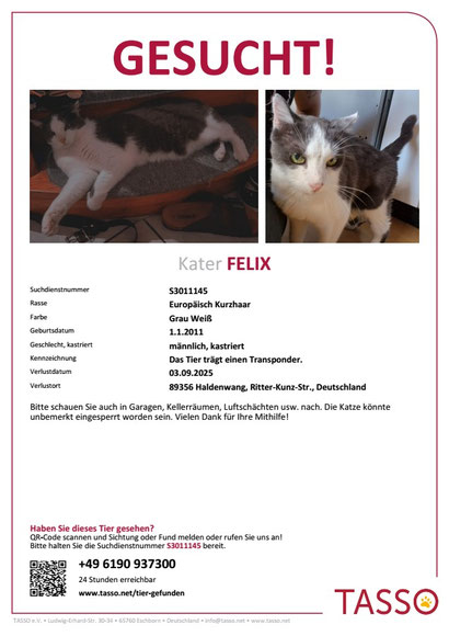 Weitere Angaben zu Felix finden Sie in seinem Suchplakat.