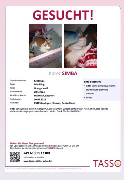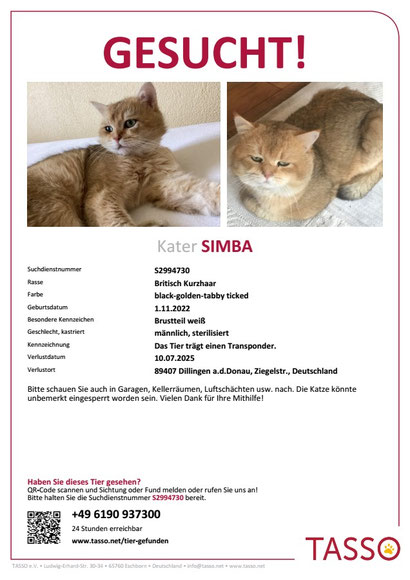 Weitere Angaben zu Simba finden Sie in seinem Suchplakat.
