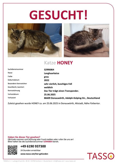 Katze Honey wird seit dem 25.06.2025 in 86609 Donauwörth vermisst.