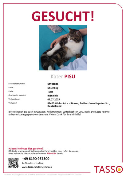 Kater Pisu wird seit dem 07.07.2025 in 89420 Gundelfingen vermisst.