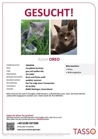 Katze Oreo wird seit dem 02.10.2025 in 86405 Meitingen vermisst.