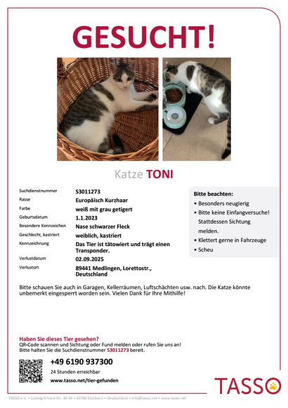Katze Toni wird seit dem 02.09.2025 in 89441 Medlingen vermisst. Wer hat sie gesehen und kann ihr wieder nach Hause helfen?