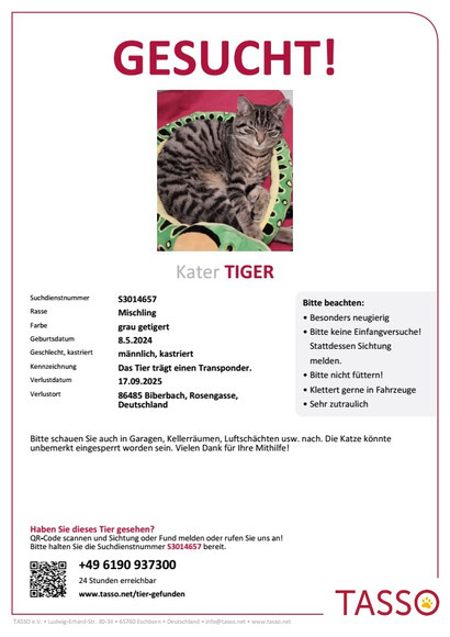 Weitere Angaben zu Tiger finden Sie in seinem Suchplakat.