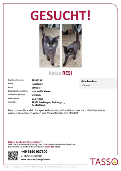 Katze Resi wird seit dem 07.07.2025 in 89561 Dischingen vermisst. Wer hat sie gesehen und kann ihr wieder nach Hause helfen?