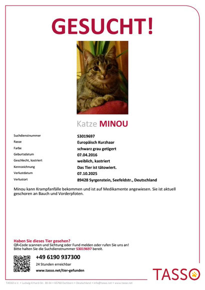 Weitere Angaben zu Minou finden Sie in ihrem Suchplakat.