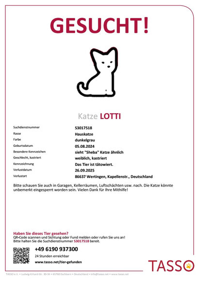 Katze Lotti wird seit dem 26.09.2025 in 86637 Wertingen vermisst.