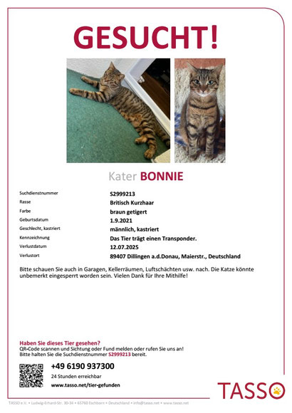 Kater Bonnie wird seit dem 12.07.2025 in 89407 Dillingen vermisst.