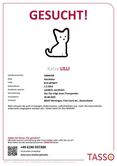 Katze Lilli wird seit dem 20.08.2025 in 86637 Wertingen vermisst.