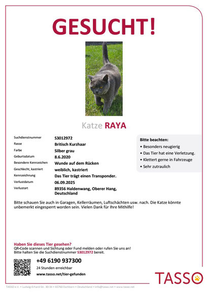 Katze Raya wird seit dem 06.09.2025 in 89356 Haldenwang vermisst. Wer hat sie gesehen und kann ihr wieder nach Hause helfen?
