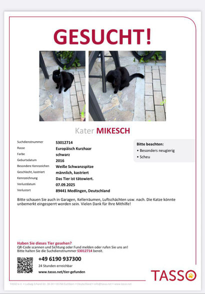 Weitere Angaben zu Mikesch finden Sie in seinem Suchplakat.