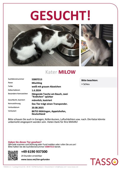 Kater Milow wird seit dem 20.08.2025 in 86753 Möttingen vermisst.