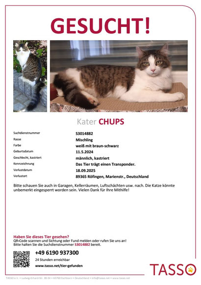 Weitere Angaben zu Chups finden Sie in seinem Suchplakat.