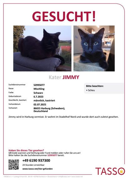 Kater Jimmy wird seit dem 02.07.2025 in 86655 Harburg vermisst. Wer hat ihn gesehen und kann ihm wieder nach Hause helfen?