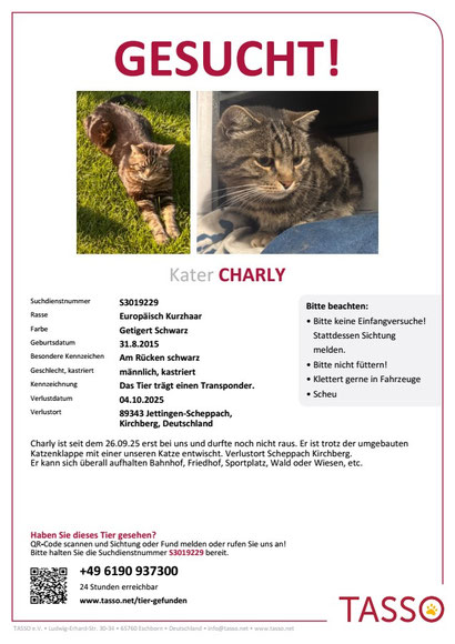 Weitere Angaben zu Charly finden Sie in seinem Suchplakat.
