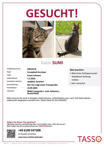 Katze Sumi wird seit dem 16.09.2025 in 86462 Langweid vermisst. Wer hat sie gesehen und kann ihr wieder nach Hause helfen?